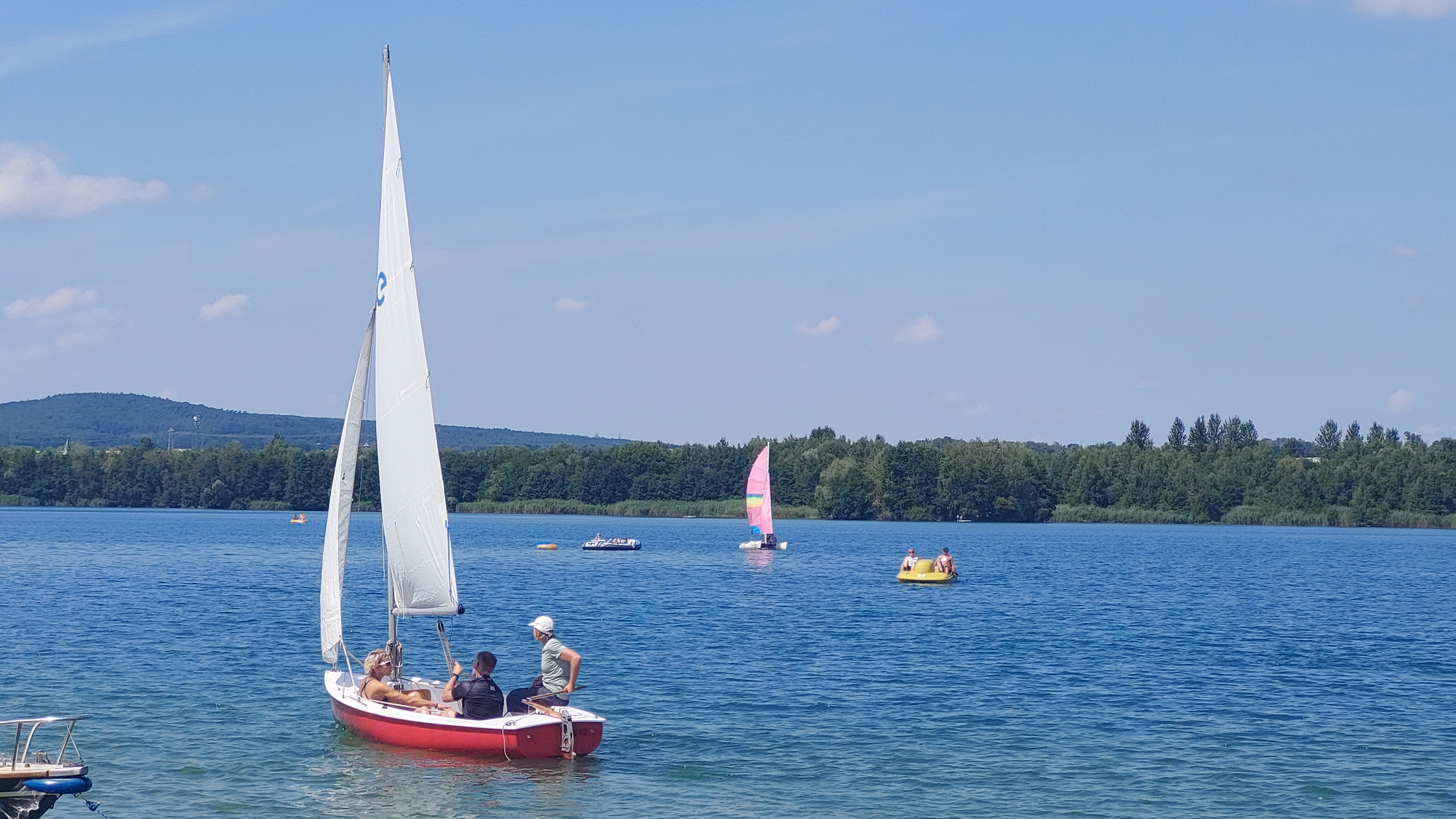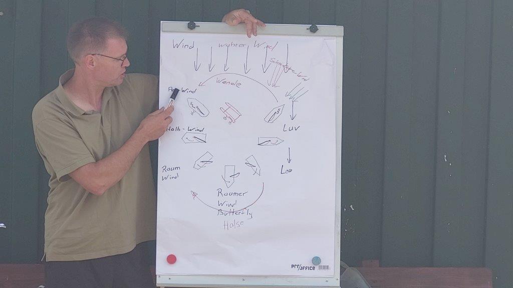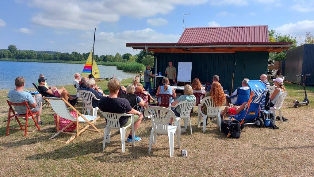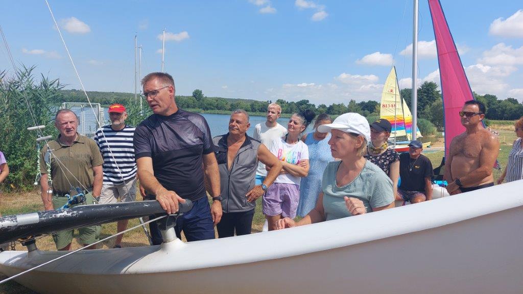 Zunächst gab es eine 2-stündige theoretische Einführung für alle, dann nach einer kurzen Kaffeepause kam der praktische Teil: zunächst wurden alle Katamarane und die Jolle unter Anleitung gemeinsam aufgebaut und und die Benutzung erklärt, dann durften die Teilnehmenden auf dem See bei wenig Wind unter Anleitung einzeln oder zu zweit üben.