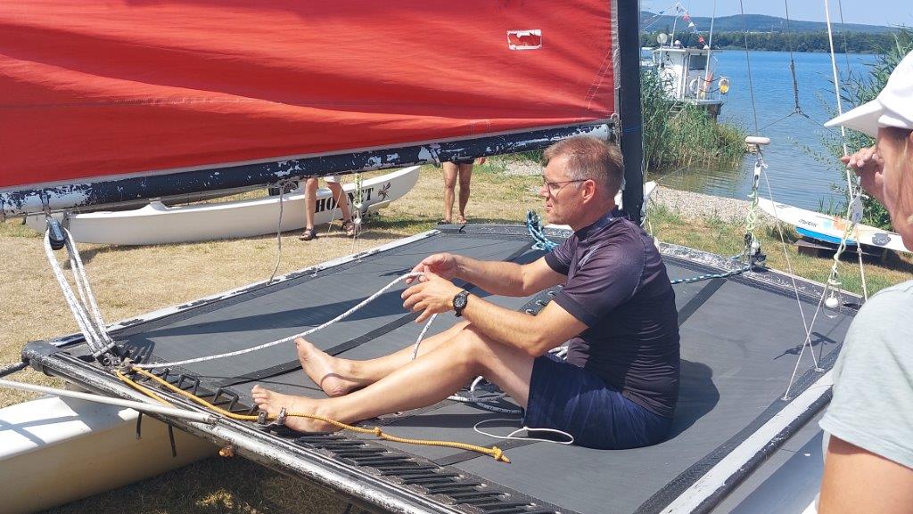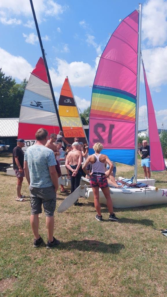 Nachdem immer mehr Vereinsmitglieder Interesse am Katamaran-bzw. Jolle segeln geäußert hatten und der Verein inzwischen zwei Katamarane und eine Jolle besitzt, fand am 23.7.22 ein Einführungskurs statt, der von unserem 1. Vorsitzenden Knut Bothe veranstaltet wurde.