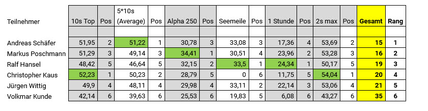 Insgesamt konnten wir dieses Jahr nur 34 Sessions fahren, wesentlich weniger als in den Vorjahren. 3 Sessions wurden am Aartalsee absolviert. Wir fokussieren uns dieses Jahr nur auf den Singliser See, Aartalsee und Edersee nehmen wir aus der Challenge raus. Die Siegerehrung findet am 23. Februar anlässlich der Jahreshauptversammlung im Seerestaurant Stockelache statt.